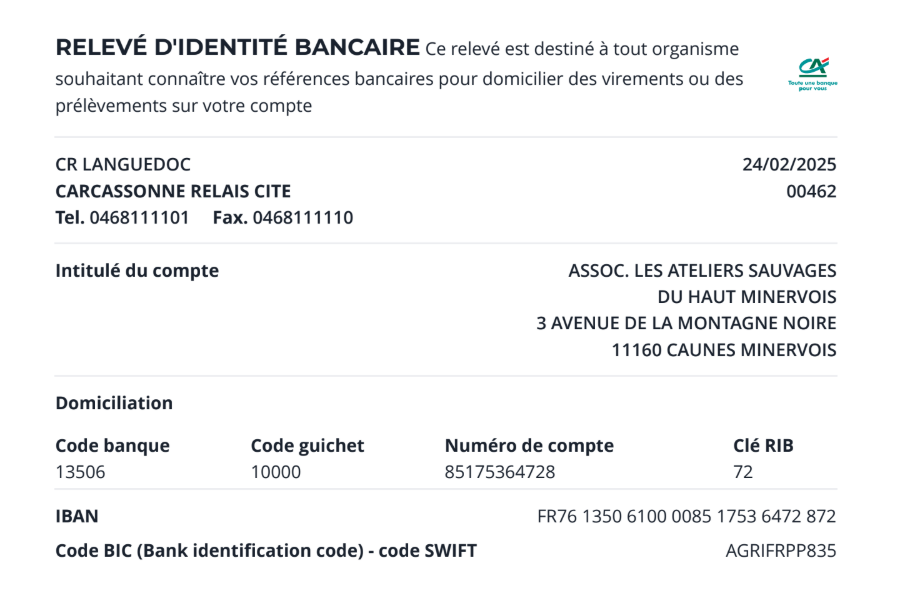 - par chèque à l'ordre des ateliers sauvages du haut minervois